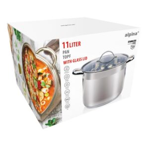 See 11-liitrine kaanega Alpina pott on mitmekülgne ja vastupidav täiendus sinu kööki, loodud suurte toidukoguste hõlpsaks mahutamiseks.