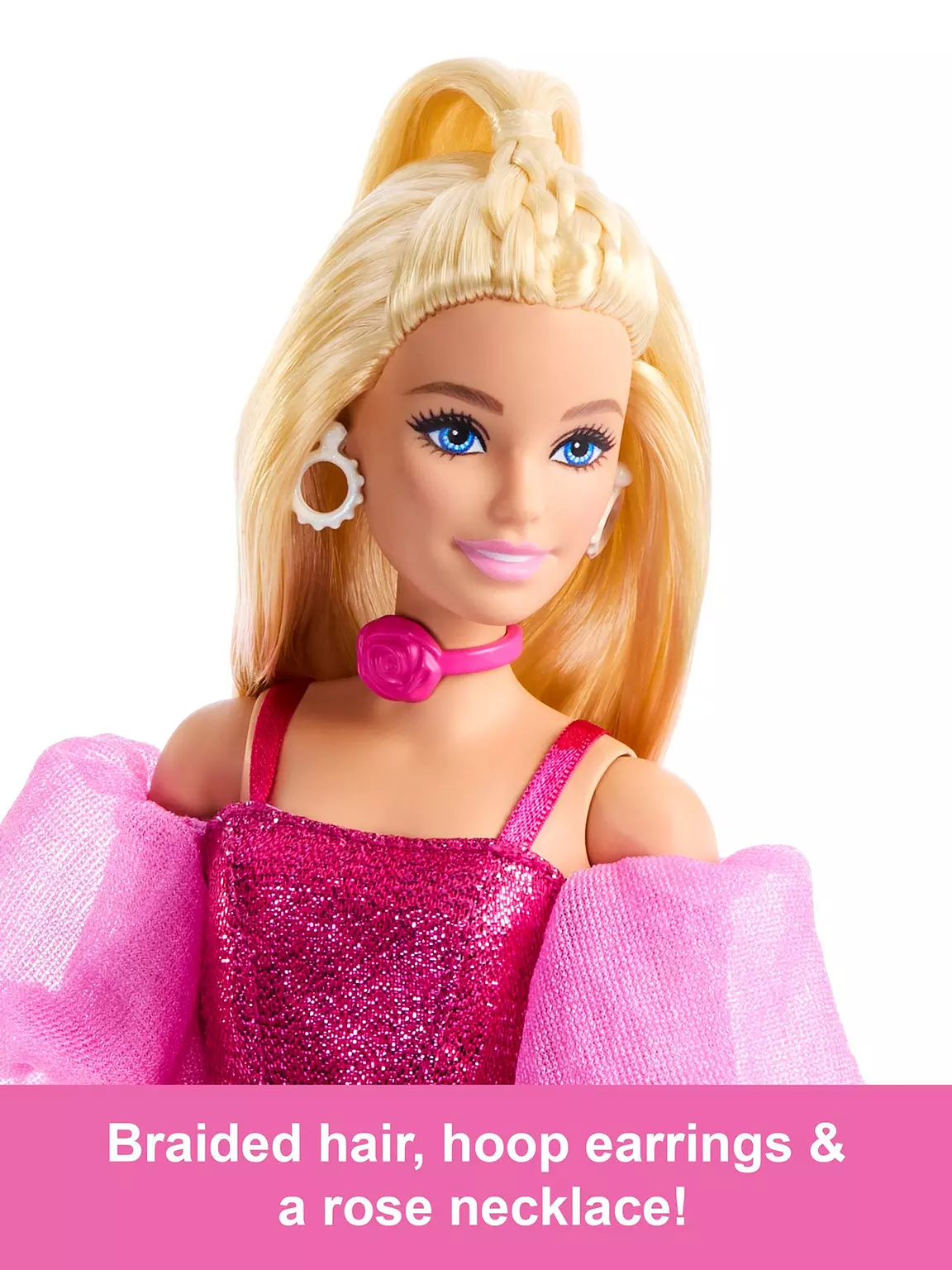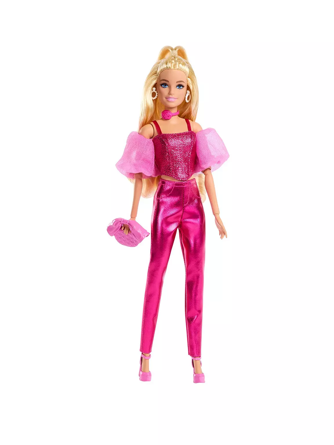 Barbie-nukk on aksessuaarid virnastatud käevõrude, lipsu ja roosade kontsadega. Painduvad liigesed võimaldavad tal võtta igasuguseid poose!