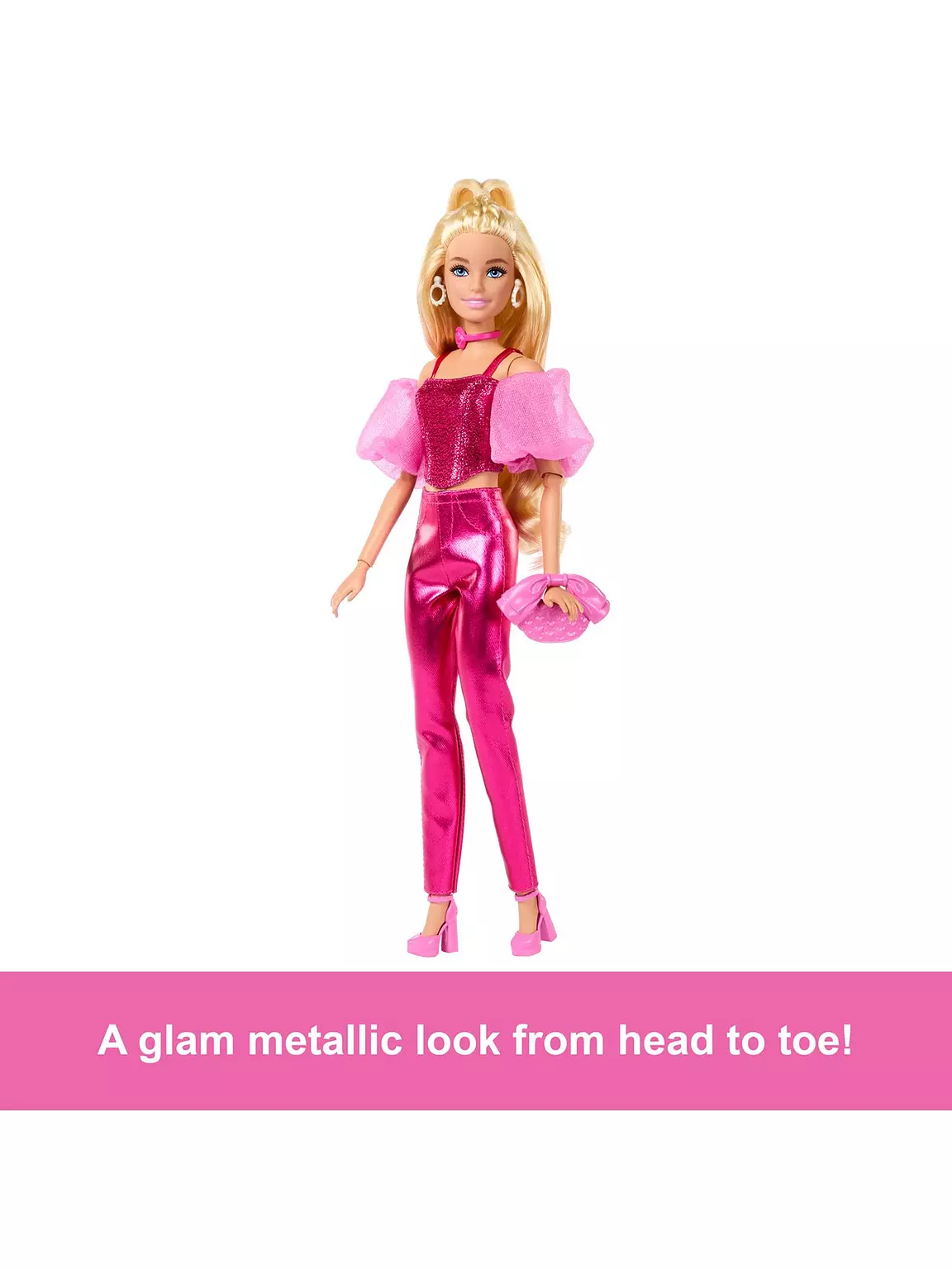 Barbie Deluxe stiilis moenukk metallikroosas kostüümis korsettide ja aksessuaaridega.