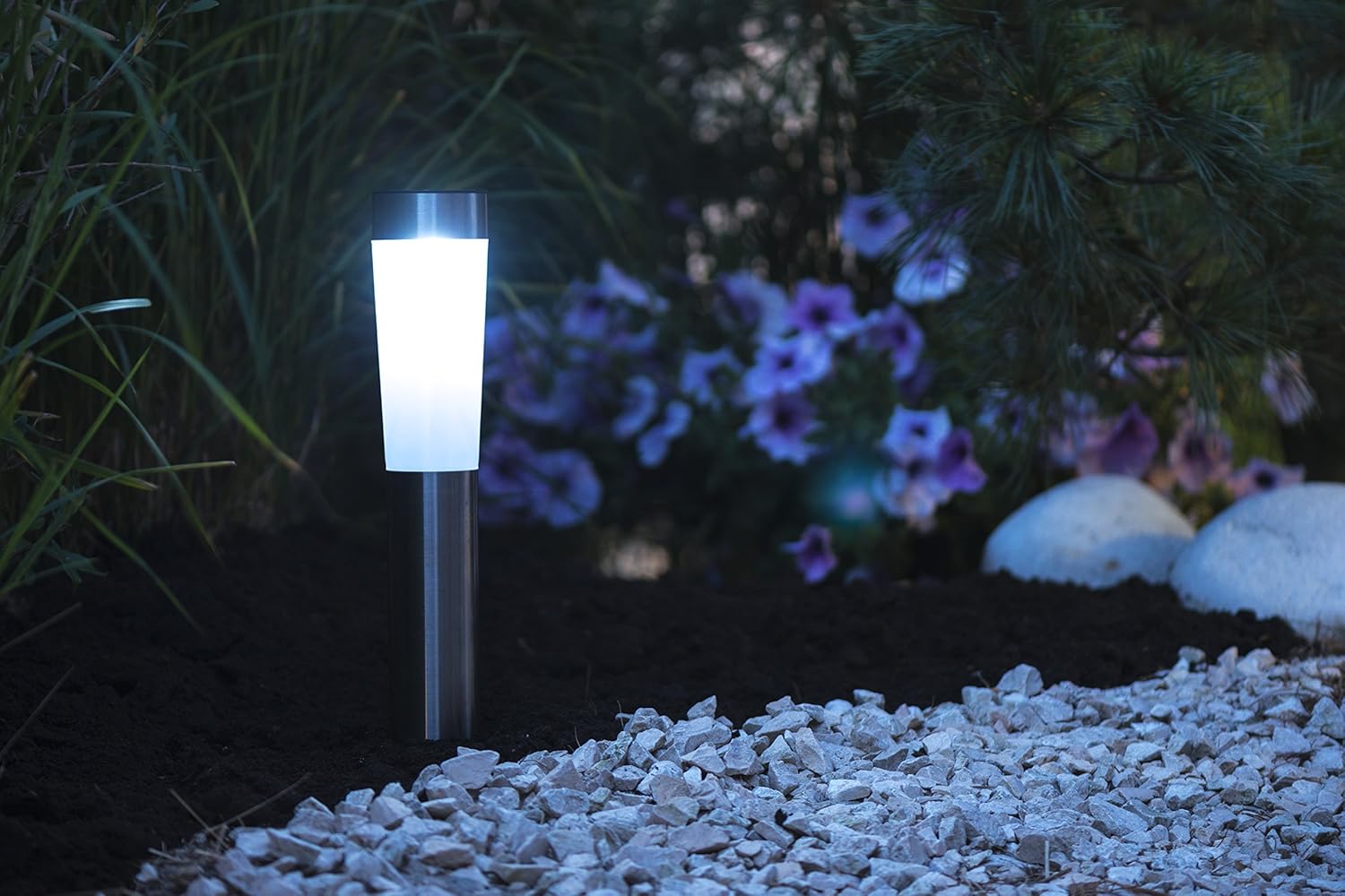 Selle roostevabast terasest valmistatud päikeseenergia LED-aialambi kõrgus on 56 cm. Päikeseenergial töötaval aialambil on maapinna nael. Latern jääb täielikult laetuna põlema umbes 6–8 tunniks.