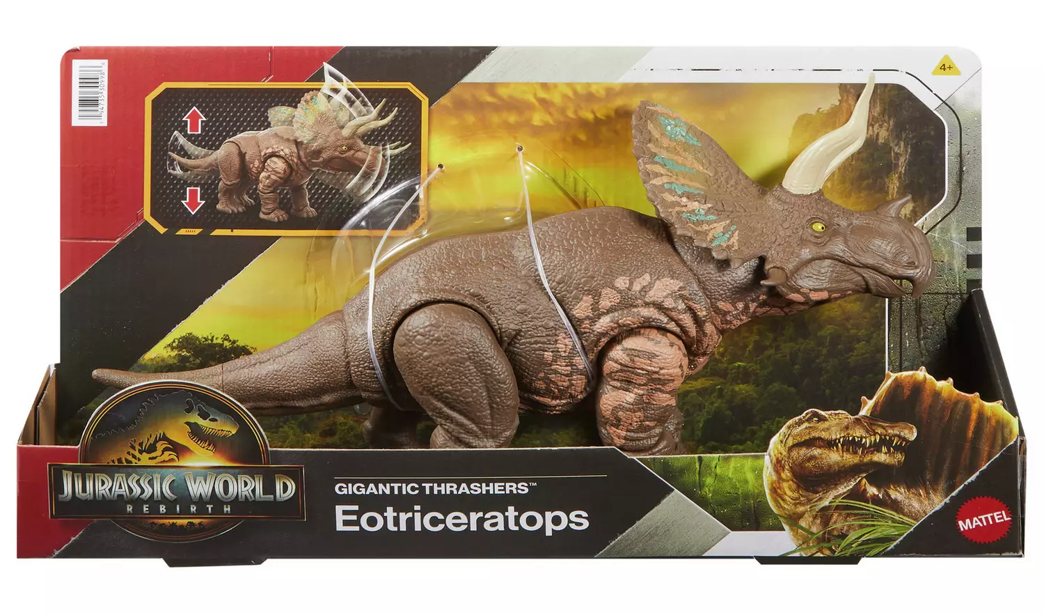 See hiiglaslik Thrashers Eotriceratops action-figuur, mis on inspireeritud Jurassic World Rebirthist, sisaldab kahte dramaatilist sabaga aktiveeritud rünnakuliigutust! Täielik rünnak liigutab saba üles-alla dramaatilise peapõrke rünnaku jaoks ning külgsuunas teise trampimise liigutuseks. 32 cm pikk, autentse skulptuuri, dekoratsiooni ja tekstuuriga, on see liigendatud suurte dinosauruste mänguasi valmis lahingumänguks või ägedaks poseerimiseks.