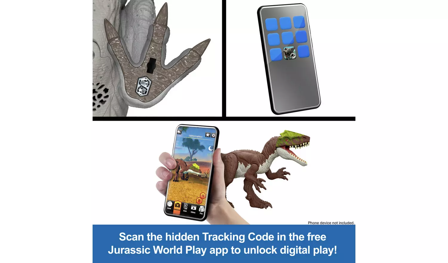Skaneeri dinosauruse jala jälgimiskoodi tasuta Jurassic World Play rakenduses ühilduva nutiseadmega (Android või iOS, mitte kaasas), et avada dinosauruse digitaalne versioon ja mängida väga lõbusat mängu, kus võistled erinevate sõidukitega maal, õhus ja merel.