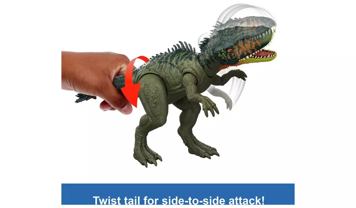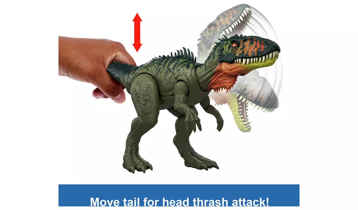 See on täielik rünnak – liiguta saba üles-alla, et saada dramaatiline pea närimisrünnak ja külgsuunas käe lõikamise tegevuseks! 345 cm pikk, autentse skulptuuri, dekoratsiooni ja tekstuuriga, on see liigendatud suurte liikide dinosauruse mänguasi valmis lahingumänguks või ägedaks poseerimiseks.