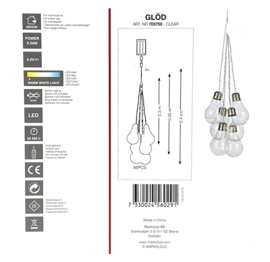 Mark Slöjd LED rippvalgusti Soe valge valgus 0,54W Toide 3xAA(ei ole kaasas) Kuus riputatavat, pirni kogupikkus 1m