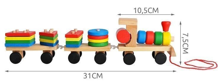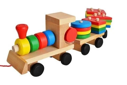 Värvikas puidust rong klotsidega, selle abil laps õpib tundma värve ja kujundeid, arendab motoorikat.
