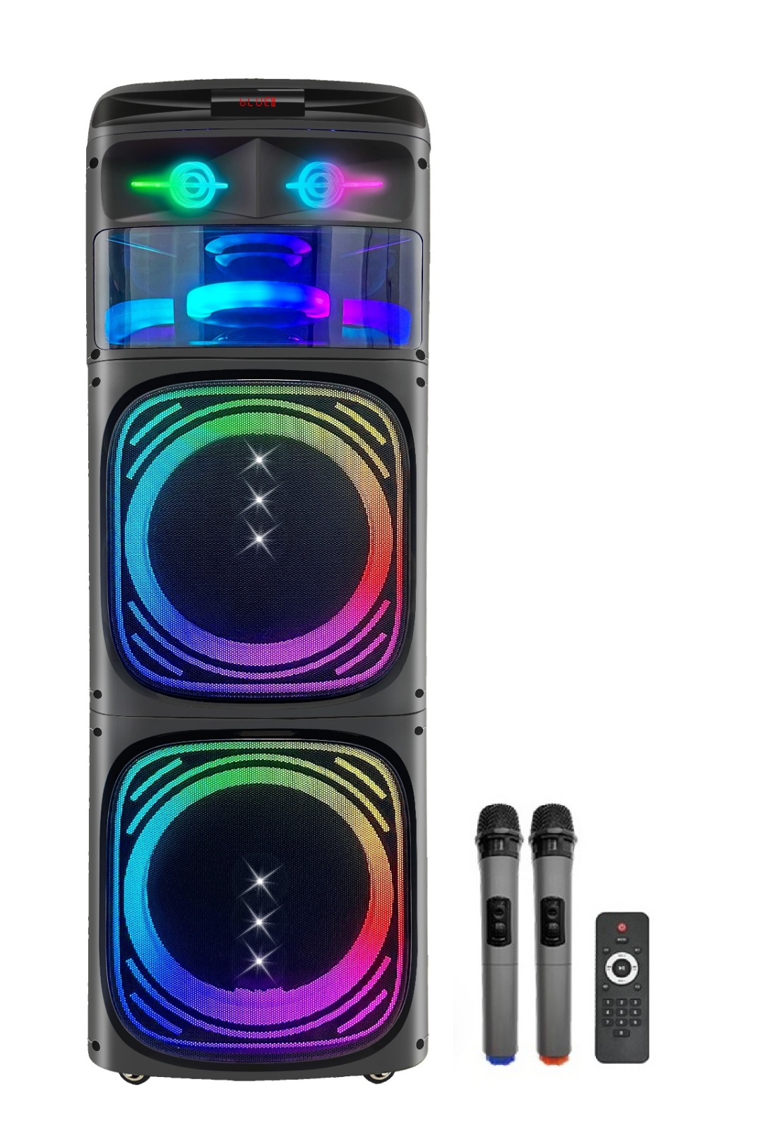 Suur laetav peokõlar kahe mikrofoniga RMS: 100W 12″ kõlar x 2 Aku: 12V7000MAH Funktsioon: USB / SD / FM / kaugjuhtimispult / Bluetooth Mõõdud 35x35x112cm