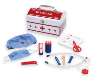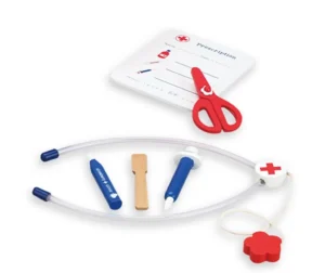 Komplekt sisaldab erinevaid tööriistu, nagu termomeeter, plaastrid, kreemid ja muud tarvikud, mis õpetavad lastele diagnostikat.