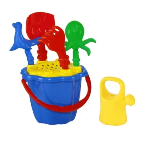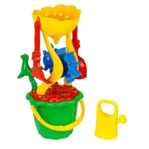 Liivamängukomplekt - liivaveski, ämber, kastekann, sõel, kaks liivavormi, reha ja kühvel.